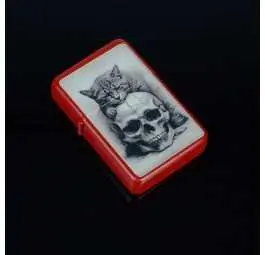 Na powierzchni zapalniczki znajduje się czarno-biała grafika realistycznej czaszki, na której spoczywa śpiący kot. Ten zaskakująco harmonijny motyw łączy w sobie mrok i spokój, tworząc intrygujący kontrast. Czerwona ramka obudowy nadaje całości wyrazistości i charakteru, czyniąc zapalniczkę nie tylko praktycznym narzędziem, ale też estetycznym mini dziełem sztuki.