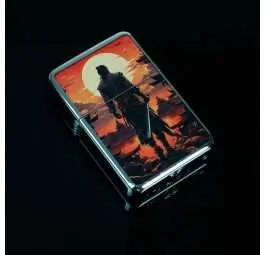 Grafika na zapalniczce ukazuje samuraja w tradycyjnym stroju, gotowego do walki lub medytacji, na tle pomarańczowo-czerwonego nieba. Całość tworzy efektowną kompozycję w klimacie japońskiego minimalizmu i siły ducha. To idealny gadżet dla osób, które cenią orientalne motywy, sztukę walki oraz filozofię bushido.