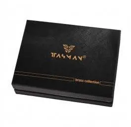 Model „Wilk” pochodzi z ekskluzywnej serii Tasman Brass Collection, w której każdy egzemplarz pakowany jest w czarne eleganckie pudełko z aksamitnym wnętrzem. W zestawie znajduje się mosiężna karta kolekcjonerska z logo Tasman i napisem „Light my fire”, co podkreśla luksusowy charakter produktu.