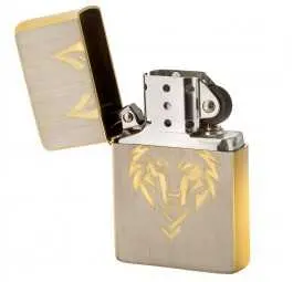 Wykonana z wysokogatunkowego mosiądzu szczotkowanego, zapalniczka zachwyca subtelnym, metalicznym połyskiem. Złote krawędzie podkreślają precyzję wykonania, a grawerowany motyw wilka nadaje jej wyjątkowego, dzikiego charakteru. Każdy detal dopracowany został z dbałością o estetykę i trwałość, co sprawia, że zapalniczka prezentuje się imponująco w każdej sytuacji.