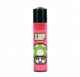 Cztery warianty zapalniczek w intensywnych kolorach to kwintesencja retro: błękitne tło z sercami życia, różowy grzybek “1UP”, klasyczny ekran końca gry oraz biała zapalniczka z monetą i tekstem “Insert Coin”. Styl graficzny to typowy pixel art – dokładnie taki, jaki pamiętasz z dzieciństwa.