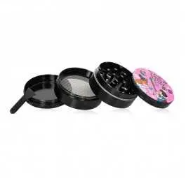 Tacka z gładkiego metalu ma fajne wykończenie i wyrazistą grafikę z hasłem „I crave a blunt with your name on it” – pasuje zarówno do śmiesznego vibe’u, jak i do poważnych sesji. Młynek 4-częściowy radzi sobie świetnie z suszem, a dolna komora pozwala zbierać pyłek. Lufka – solidna, metalowa z różowym wzorem – robi robotę i pasuje wizualnie do całości. Popielniczka z grubego szkła w kształcie zaciśniętej pięści to mocny dodatek, który robi efekt wow.